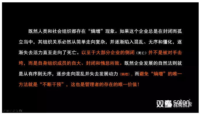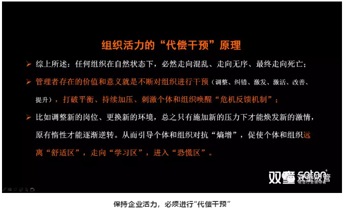 而避免“熵增”的唯一方法就是持續(xù)開放和組織干預(yù),從而打破平衡,持續(xù)加壓、刺激個體和組織喚醒“危機(jī)反饋機(jī)制”,這也是管理者的存在的唯一價值!