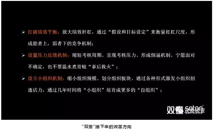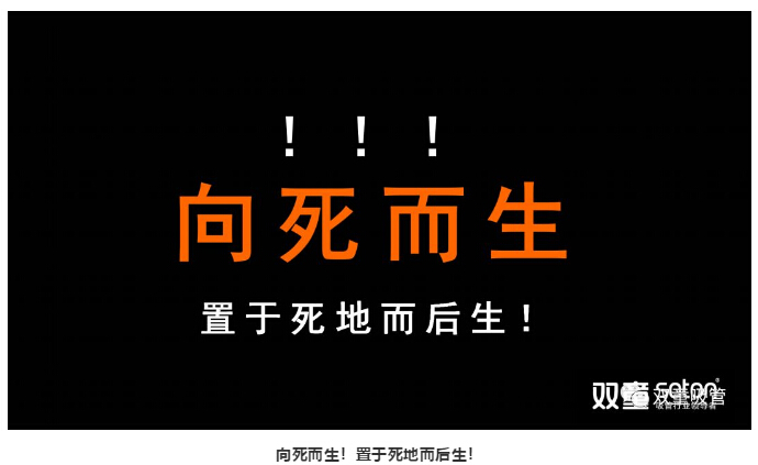 在這次變革中,“雙童”第一次破天荒提出了以“死亡”為假設(shè)命題,引進(jìn)“向死而生,置于死地而后生”的概念讓團(tuán)隊(duì)意識到自己所面對的危機(jī),從而讓員工和組織管理層認(rèn)知到死亡即將到來之時,激發(fā)團(tuán)隊(duì)產(chǎn)生強(qiáng)烈危機(jī)感,從而實(shí)現(xiàn)對組織管理的及早干預(yù),以此推動企業(yè)獲得“生”的能力,獲得組織生命的延伸!