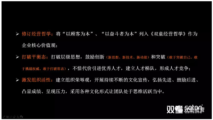 這樣一種邏輯其本質(zhì)是建立對員工和組織共同創(chuàng)造的基礎(chǔ)之上,離開了創(chuàng)造和彼此奉獻(xiàn),所謂的人性關(guān)愛是得不到基礎(chǔ)支撐的,企業(yè)必然會走向衰弱、死亡!“雙童”業(yè)已形成的“家”就不復(fù)存在!作為理性的認(rèn)知,“雙童”本質(zhì)上是所有員工的創(chuàng)業(yè)平臺,而不是休閑和養(yǎng)老的地方。所以,樓仲平非常理性的引導(dǎo)員工認(rèn)知:“‘雙童’不是你的家、沒有‘動力’請回家!”