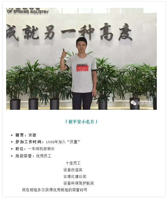 踏實(shí)肯干,敢于嘗試,勇于探索……今天,吸管妞要帶大家認(rèn)識(shí)的主人公是一位忠誠(chéng)追隨“雙童”二十多年的老員工侯平安,講述他從18歲小伙成長(zhǎng)為如今獨(dú)當(dāng)一面車間班組長(zhǎng)的精彩故事!