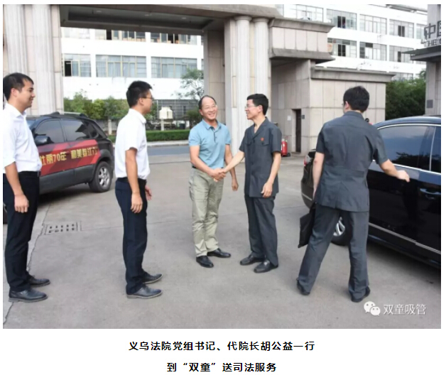 9月9日下午,在“70法官服務(wù)70+企業(yè),打造最佳營(yíng)商環(huán)境”活動(dòng)的啟動(dòng)儀式后,義烏法院黨組書記、代院長(zhǎng)胡公益帶領(lǐng)蘇溪法庭、知識(shí)產(chǎn)權(quán)庭、辦公室等部門負(fù)責(zé)人第一時(shí)間到達(dá)“雙童”,了解企業(yè)在生產(chǎn)經(jīng)營(yíng)過(guò)程中的司法需求及送司法服務(wù)。