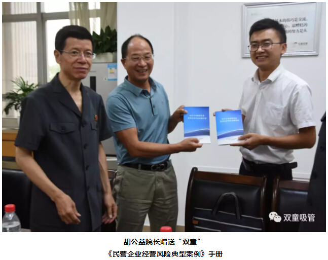 會(huì)上,胡公益院長(zhǎng)也向樓仲平了解企業(yè)生產(chǎn)經(jīng)營(yíng)過(guò)程中的司法需求,并贈(zèng)送《民營(yíng)企業(yè)經(jīng)營(yíng)風(fēng)險(xiǎn)典型案例》手冊(cè)。同時(shí),“雙童”樓仲平也對(duì)胡公益院長(zhǎng)一行人的親自到訪、上門服務(wù)及贈(zèng)送《民營(yíng)企業(yè)經(jīng)營(yíng)風(fēng)險(xiǎn)典型案例》手冊(cè)表示十分感謝!