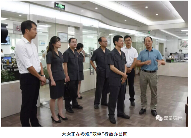 參觀完中國(guó)吸管博物館之后,義烏法院黨組書記、代院長(zhǎng)胡公益一行人在樓仲平的帶領(lǐng)下參觀“雙童”公開、透明的行政辦公區(qū)。