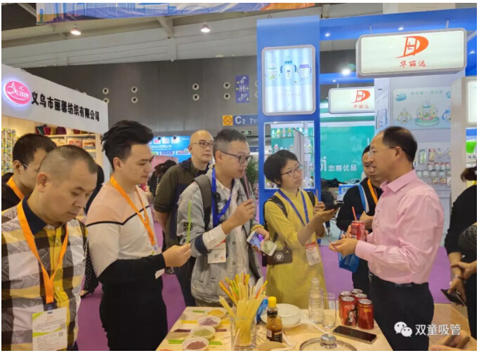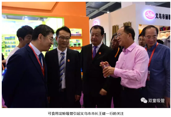 在義博會(huì)上,“雙童”可食用淀粉吸管成為了展會(huì)“大明星”,不僅引起了義烏市市長王健一行和外商客人的關(guān)注,而且也吸引了大批新老客戶駐足洽談。