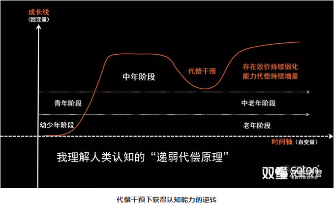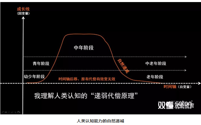 所以,我用一個“認知能力”思維模型給大家說明:人類發(fā)展中的成長性是能夠無窮拓展的。比如正常來講,看一個人的認知能力,從幼年、少年、青年,到中年處于一個鼎盛階段,到中老年階段之后就進入到自然遞減的過程。