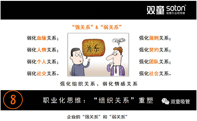 這樣的一種弱關(guān)系原則可以讓管理者將大部分的精力專注于企業(yè)內(nèi)部的管理,專注于事務解決,從而建立起一套健康發(fā)展的管理邏輯。