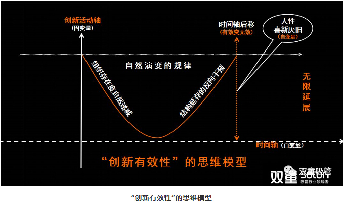 由此可以推導出,創(chuàng)新是創(chuàng)業(yè)活動的前提,是不得不為之的“生存干預”。在這個干預過程當中大家要理解,它某種程度上是滿足人性的底層,它有一個不變的規(guī)律就是在時間軸后移的情況下創(chuàng)新有效變無效,所以創(chuàng)新是一個無限延展的過程。