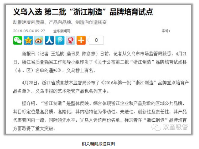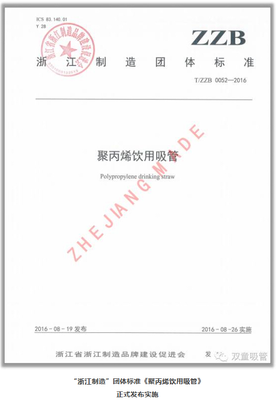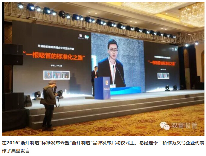 雙童成為義烏首家“浙江制造”標準企業(yè) 首先,讓我們來回顧一下“雙童”成為義烏首家制訂“浙江制造”標準企業(yè)的過程: 2016年年初,經浙江省質量技術監(jiān)督局、浙江省標準化研究院等相關領導專家團隊多次論證,認為“聚丙烯飲用吸管”符合“浙江制造”定位要求,推動聚丙烯飲用吸管品牌認證具有重大意義,決定將“聚丙烯飲用吸管”列入2016年“浙江制造”品牌認證目錄,并由“雙童”主導制訂“浙江制造”《聚丙烯飲用吸管》標準。