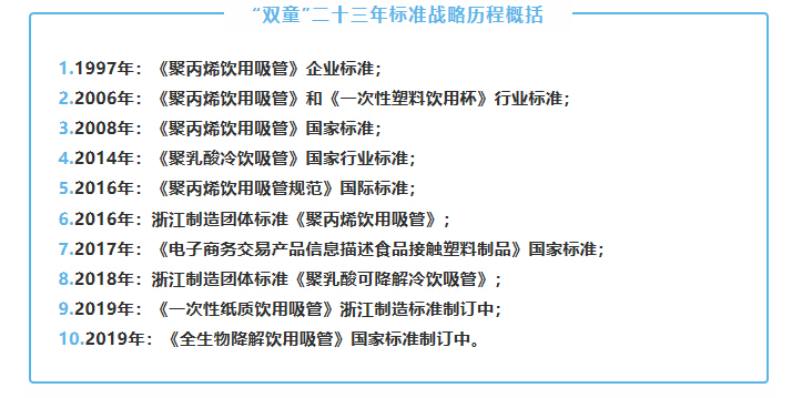 正是因為“雙童”持續(xù)主導吸管行業(yè)標準的制定,使得“雙童”始終站在行業(yè)的制高點,直接推動企業(yè)的品質管理體系的建立、改善和提升,直接影響企業(yè)的品牌傳播,并最終獲得吸管產(chǎn)業(yè)的話語權、規(guī)則權和定價權,成為全球吸管行業(yè)的領導者!