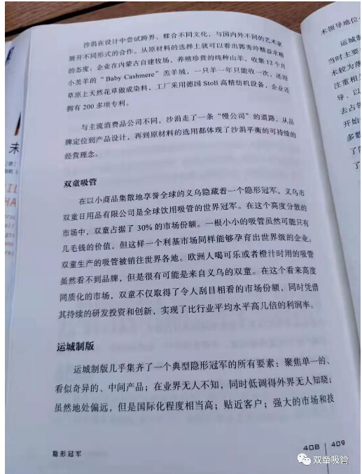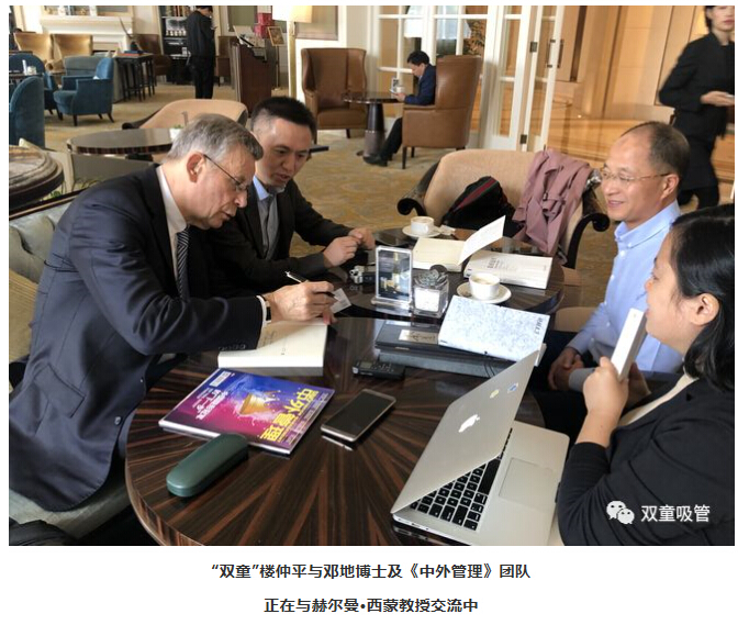 中國企業(yè)千千萬,說到“隱形冠軍”也有不少,可為何此次《中外管理》雜志特別邀請了樓仲平一同前往采訪西蒙教授呢?原來,早在2018年的首屆“中國造·隱形冠軍”評選活動中,“雙童”就經(jīng)過陳春花教授等七位評委專家的評選,從24家優(yōu)秀企業(yè)中脫穎而出,被推選為首批“中國造·隱形冠軍”。除此之外,在西蒙教授最新所著的《隱形冠軍》一書中,“雙童”也作為隱形冠軍企業(yè)案例被收錄其中!所以,此次的采訪“隱形冠軍之父”西蒙教授之行,“雙童”樓仲平作為中國隱形冠軍企業(yè)代表參與其中,也是再合適不過了!