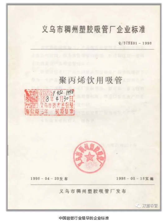建設工廠缺少資金,樓仲平不僅把全部積蓄投進去,還關掉了義烏市場一直在盈利的攤位;沒有行業(yè)標準,只有小學文化的他,自己埋頭鉆研制定指標、量化參數。1997年10月,由“雙童”起草的Q/YCSX01《聚丙烯飲用吸管》企業(yè)標準審核通過,成為吸管行業(yè)最早的產品標準。