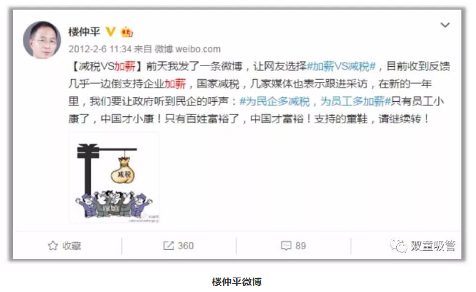 無獨有偶,其實早在2012年,樓仲平就發(fā)布了一條關于“員工加薪”的微博,引起了極大的關注。微博上寫道:“為民企多減稅,為員工多加薪,只有員工小康了,中國才小康!”樓仲平認為,員工是企業(yè)的基礎,只有員工穩(wěn)定了,企業(yè)才會穩(wěn)定,只有員工提升了,企業(yè)才會更好發(fā)展,對員工更好了,企業(yè)反而會獲得更多!