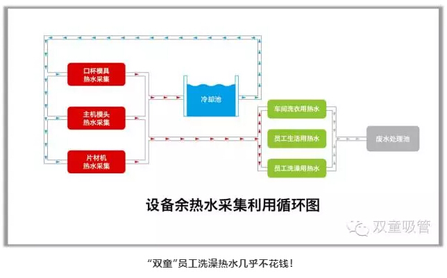 “雙童”對所有經(jīng)過模具的50度溫水進行收集,處理之后供應到所有寢室衛(wèi)生間給員工洗澡洗衣生活之用。同時,“雙童”對所有生產(chǎn)設備的余熱和廢氣進行采集并回收,再通過空調(diào)管道輸送到需要加溫的各個車間和工段。通過上述方式,“雙童”光是在余熱水采集和設備余熱采集方面,每年就節(jié)省了150多萬元,消滅了企業(yè)產(chǎn)生的污染和排放!