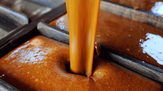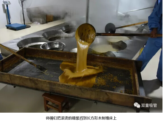 等到將全部濃稠的糖漿起到最末端的一口鍋中,看看差不多了,就將滾燙的糖漿,舀到一個(gè)長(zhǎng)方形的木制槽床上,制作成精細(xì)的紅糖,這些紅糖可以加工成麻花等紅糖產(chǎn)品。