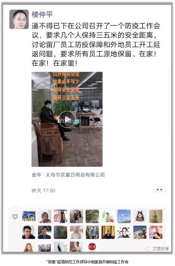 面對(duì)新型冠狀病毒感染的肺炎疫情,“雙童”也在第一時(shí)間響應(yīng)政府號(hào)召,向員工們發(fā)出了關(guān)于做好當(dāng)前疫情防控工作的倡議書,緊急開展防疫工作會(huì)議,讓所有員工在家休息,緩返義烏!