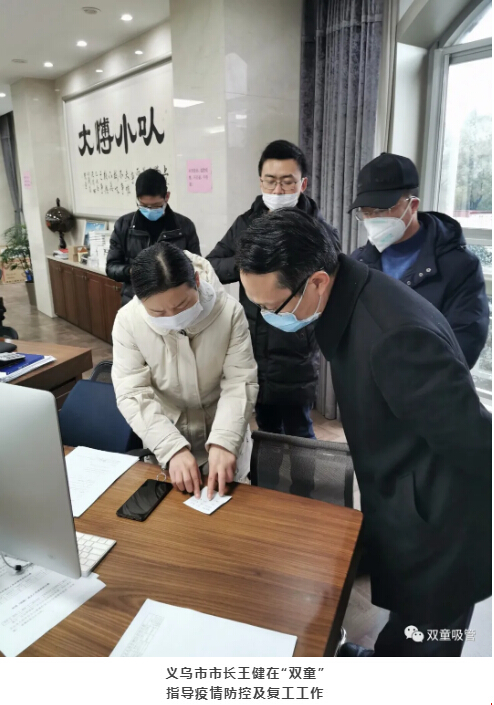 除了義烏市稅務(wù)局捐贈(zèng)的防疫物資外,在此次抗疫復(fù)工過程中,“雙童”深刻感受到義烏市政府對(duì)我們的支持和幫助。義烏市市長(zhǎng)王健、副市長(zhǎng)賈文紅也曾來到“雙童”指導(dǎo)疫情防控和復(fù)工工作,時(shí)刻關(guān)注“雙童”的復(fù)工發(fā)展。