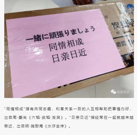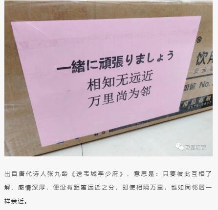 于是,吸管妞在這次援助日本友人的物資包裝箱上同樣也相贈(zèng)了“相知無(wú)遠(yuǎn)近,萬(wàn)里尚為鄰”、“同情相成,日親日近”等詩(shī)句,以表達(dá)我們對(duì)日本友人的友好之情。