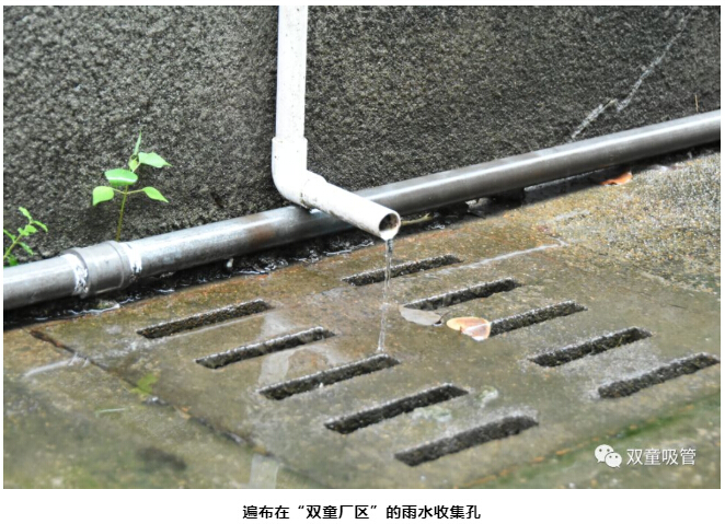 在“雙童”廠區(qū)內(nèi)有著縱橫交錯(cuò)的管道,這些管道“上天入地”,把一個(gè)個(gè)雨水坑和蓄水池有序連接,并延伸進(jìn)廠區(qū)車間和生活區(qū)的眾多角落。