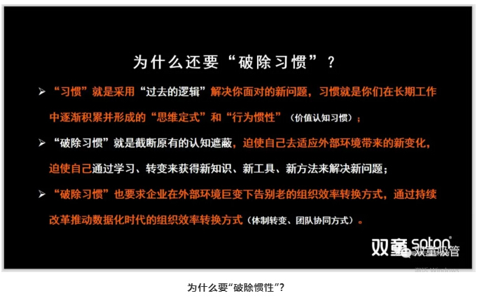 為什么要破除慣性呢?因為習慣就是采用“過去的邏輯”解決你面對的新問題,是大家在長期工作中逐漸積累并形成的“思維定式”和“行為慣性”。