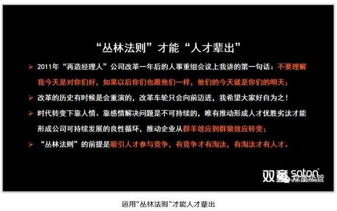 如今時代轉(zhuǎn)變下,靠人情、感情解決問題是不可持續(xù)的,唯有吸引人才參與競爭,推動人才優(yōu)勝劣汰,才能形成公司可持續(xù)發(fā)展的良性循環(huán),推動企業(yè)從群羊效應到群狼效應轉(zhuǎn)變。所以,公司里的每一個人,也應該作出轉(zhuǎn)變,破除慣性、轉(zhuǎn)換思維、提高效率,否則都將在激烈的人才競爭中被淘汰!