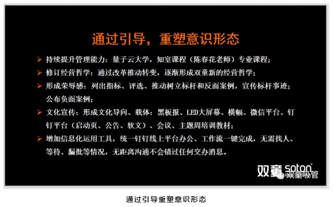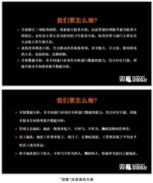 在樓仲平分享結(jié)束后,總經(jīng)理李二橋和大家分享了全面圍繞提升組織效率而展開的改革落地方案,包括重建“雙童”改革小組和安全衛(wèi)生秩序檢查小組、形成崗位競爭推動優(yōu)勝劣汰、推動車間數(shù)據(jù)分析能力、全面做好改革宣傳工作和文化引導工作、結(jié)合線上辦公平臺提升企業(yè)信息化水平等,在企業(yè)內(nèi)部建立起“以奉獻者為先、以奮斗者為本”的新時代價值觀!