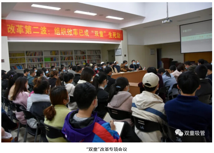 2020年4月2日,“雙童”推動(dòng)企業(yè)第二波改革活動(dòng),提出“組織效率已成雙童生死劫”!在改革動(dòng)員大會(huì)中,樓仲平一再?gòu)?qiáng)調(diào):“‘雙童’不是你的家、沒(méi)有‘動(dòng)力’請(qǐng)回家!”
