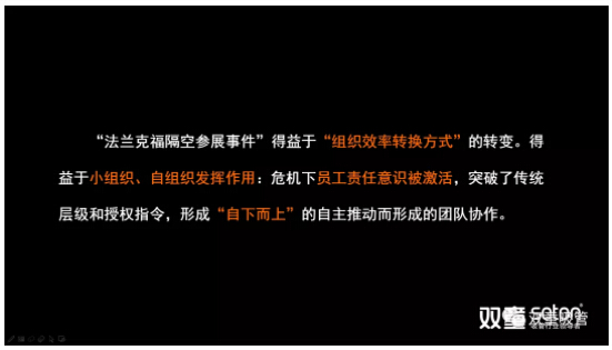 “法蘭克福隔空參展事件”得益于“組織效率轉(zhuǎn)換方式”的轉(zhuǎn)變,公司通過(guò)機(jī)制和體制的變革,把核心管理者轉(zhuǎn)變?yōu)榻?jīng)營(yíng)者,在企業(yè)內(nèi)形成若干個(gè)小組織和自組織,從而促進(jìn)組織效率的提升。