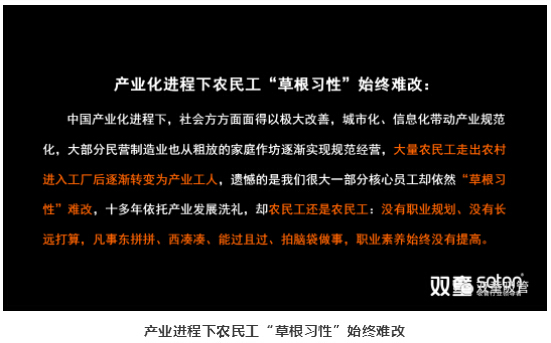 為何“雙童”要強(qiáng)調(diào)提升工作效率呢?在產(chǎn)業(yè)化進(jìn)程下,大量農(nóng)民工進(jìn)入工廠后逐漸轉(zhuǎn)變?yōu)楫a(chǎn)業(yè)工人,但遺憾的是我們很大一部分核心員工卻依然“草根習(xí)性”難改,沒(méi)有職業(yè)規(guī)劃、沒(méi)有長(zhǎng)遠(yuǎn)打算,職業(yè)素養(yǎng)始終沒(méi)有提高。