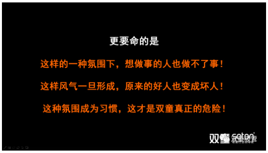 更要命的是,這樣的風(fēng)氣一旦形成,原來(lái)的“好人”也變成“壞人”。這種氛圍一旦形成,“雙童”想做事的員工也做不了事。這樣的氛圍成為習(xí)慣,這才是“雙童”真正的危險(xiǎn)!