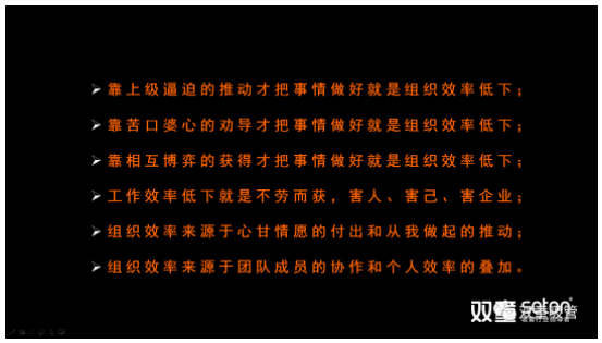 所以,提升員工工作效率已急不可待!在改革動(dòng)員大會(huì)上,“雙童”樓仲平提出了改善“組織效率”的順口溜,并成為全體員工的方向引領(lǐng),讓全體員工明白哪些行為是組織效率低下的行為,讓所有員工感悟到組織效率來(lái)源于團(tuán)隊(duì)成員的協(xié)作和個(gè)體效率的疊加,更直接地說(shuō),你的工作效率就是組織效率!