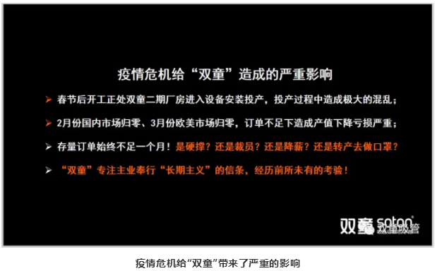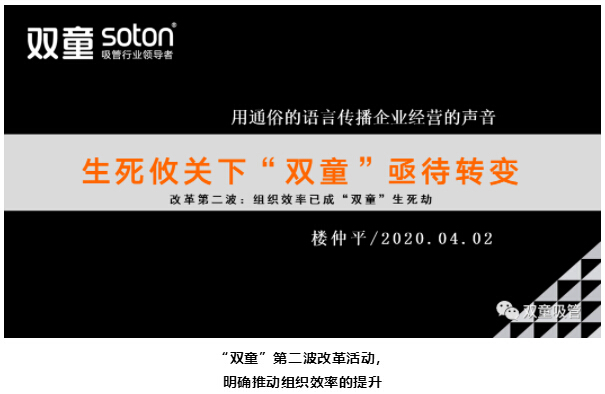 因此,在危機來臨之時,“雙童”并沒有恐慌,而是選擇抓住機會,迎接挑戰(zhàn)。但是在很多身邊的同行都開始轉(zhuǎn)行做口罩,做防疫物資的時候,奉行長期主義的“雙童”認為,轉(zhuǎn)行踩風(fēng)口做口罩我們并不擅長。所以,4月2日,“雙童”開始推動企業(yè)第二波改革活動,明確推動組織效率的提升。