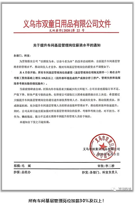 在危機裁員降薪風(fēng)潮盛行的當下,恰恰是我們推動組織變革的好時機。所以,“雙童”借力于這樣一個機會,發(fā)布了加薪文件,給所有車間基礎(chǔ)管理崗位加薪30%及以上!也希望通過此舉引進更多的優(yōu)秀管理人才,實現(xiàn)優(yōu)勝劣汰,從而激發(fā)組織中每個員工的積極性。