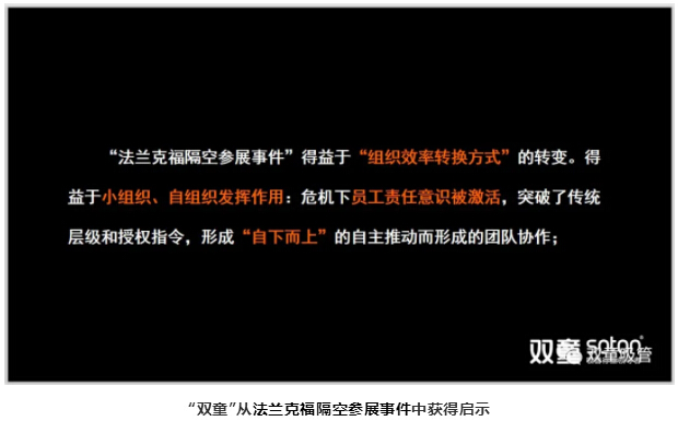 在這個過程中,組織效率發(fā)生了轉(zhuǎn)變,從以往的“要你做”,變成了現(xiàn)在的“我要做”,突破了指令的授權(quán),實現(xiàn)了團隊的協(xié)作??梢哉f如果“雙童”沒有進行組織轉(zhuǎn)變,這樣的事情就不太可能發(fā)生。