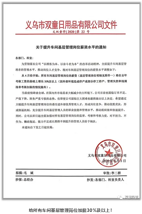 不僅如此,”雙童”在第二波改革推進過程當中,明確給所有車間基層管理崗位加薪30%及以上,目的是為了吸引外部優(yōu)秀的生產管理人才進入,形成倒逼機制,推動崗位競爭,解決組織效率低下、團隊老化的問題,實現優(yōu)勝劣汰,從而讓用心做事的人得益,讓追求結果的奮斗者得到彰顯!