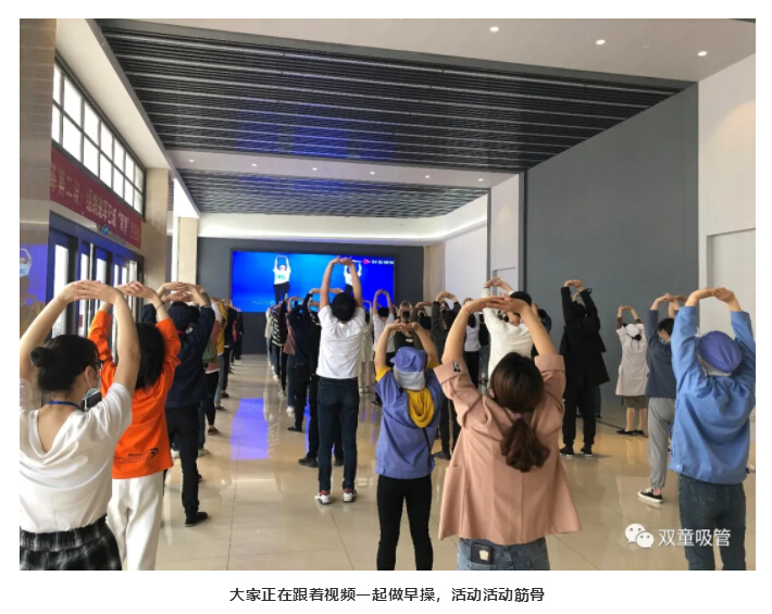 俗話說:“一日之計(jì)在于晨,一周之計(jì)在于首!”工作雖然很重要,但是我們的身體素質(zhì)也非常重要!因此,每周一在“雙童”新廠區(qū)大廳,員工們列隊(duì)整齊,精神飽滿,氣宇軒昂,伴著豪邁的音樂,用整齊劃一的動(dòng)作做起早操,形成了一道靚麗的風(fēng)景線。
