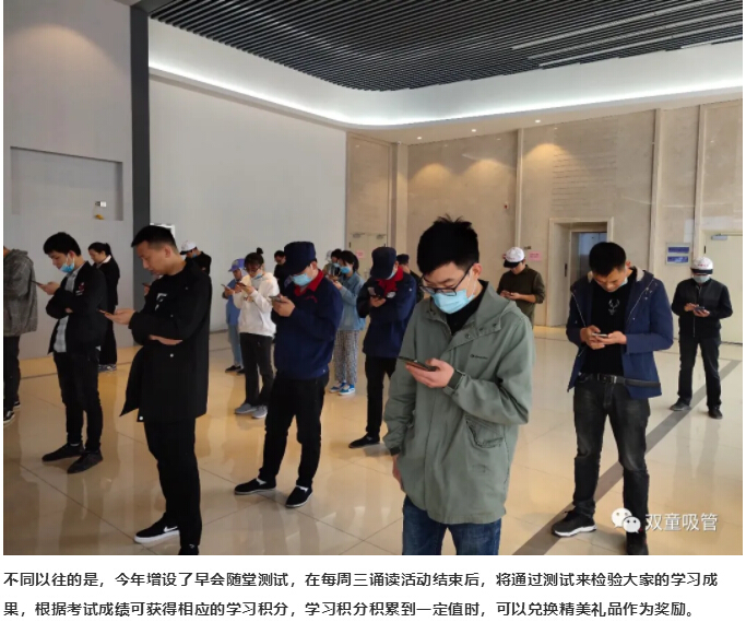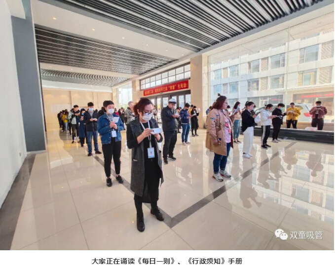 在此期間,大家一同誦讀《每日一則》,《行政須知》手冊等企業(yè)文化內(nèi)容,俗語說:“書讀百遍,其義自見”,通過誦讀活動(dòng),將“雙童”的企業(yè)文化灌輸給員工們,根植于員工內(nèi)心深處,潛移默化地改變員工的思維認(rèn)知!