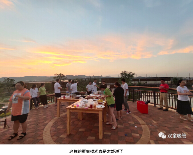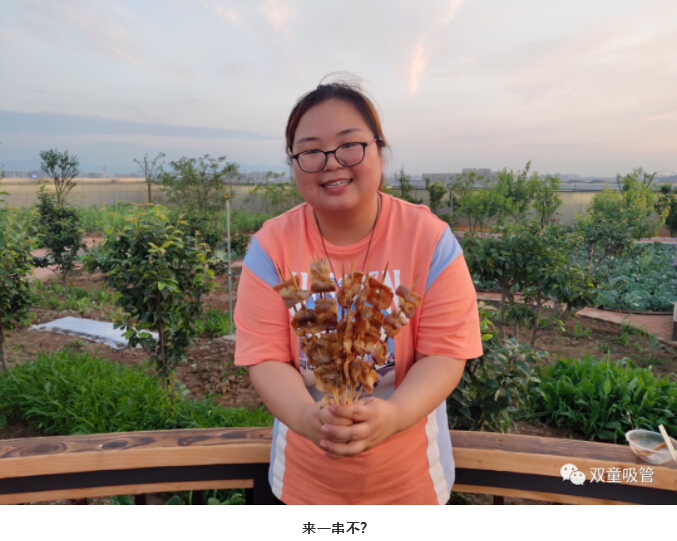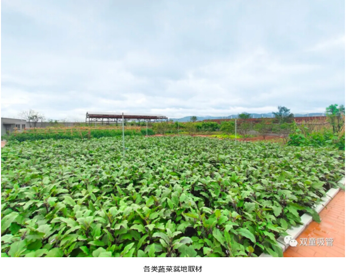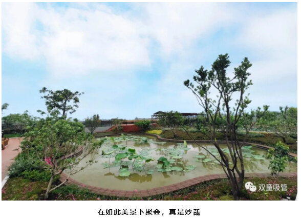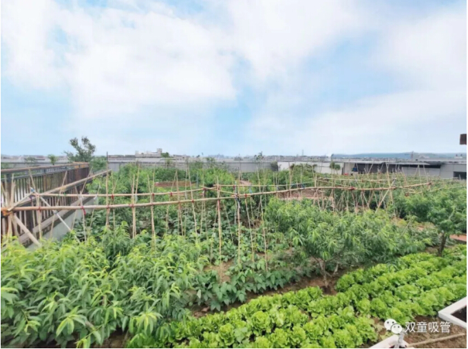 看!聚會(huì)的地點(diǎn)就在“雙童”新廠房5000平米的“屋頂果園”及空中學(xué)習(xí)吧,200多棵果樹茁壯成長,還有菜地、池塘、藕塘、百花池等,瓜果蔬菜……晚餐的食材大部分可以就地取材,真是太贊啦!
