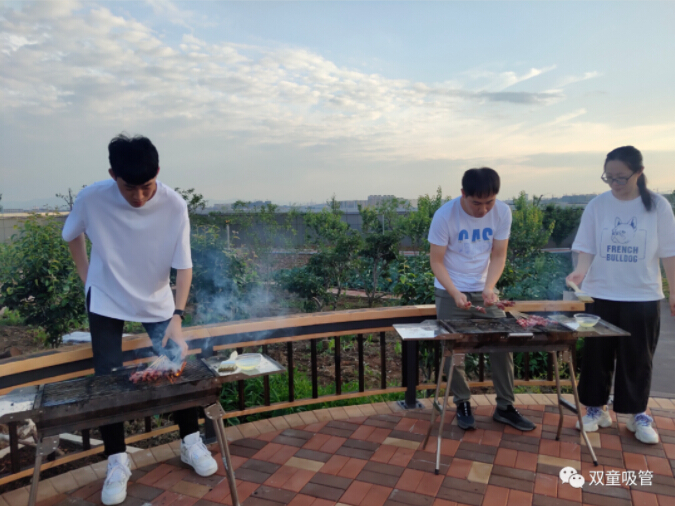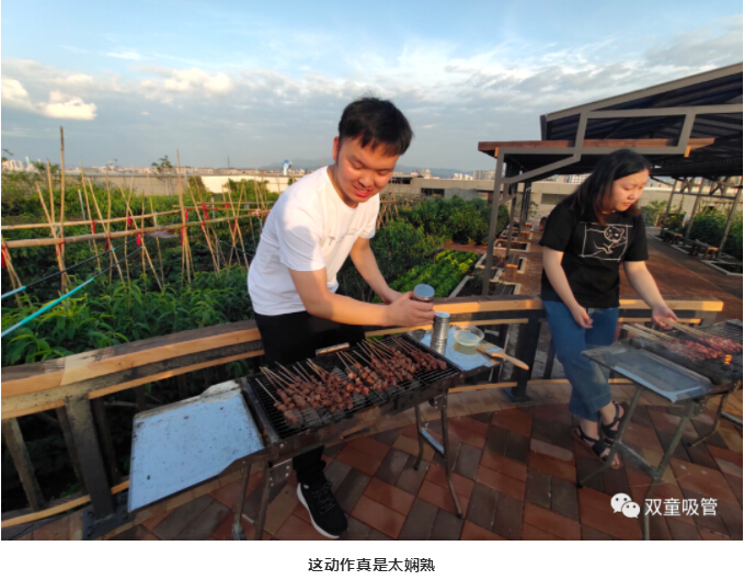 在“屋頂池塘”邊就是果樹下的燒烤平臺(tái)啦!燒烤區(qū)的同事們默默地奉獻(xiàn)著,炙熱的炭火,食物開始滋滋冒油,顏色漸轉(zhuǎn)焦黃,空氣彌漫著誘人因子,令人垂涎三尺……