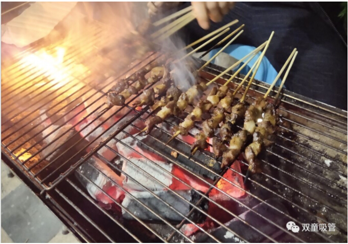 大伙手上的肉串還沒吃完,“燒烤小販”們已經(jīng)笑瞇瞇地把新烤好的肉串奉上了,吃都來不及,這是什么節(jié)奏!