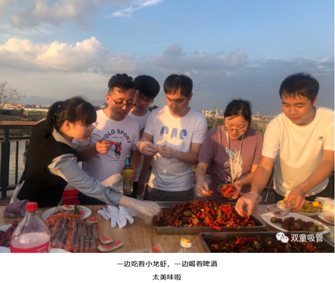 伴隨著香味,同事們齊聚在燒烤平臺(tái),大盆吃菜,大口喝酒。小龍蝦配著啤酒,吃著現(xiàn)釣現(xiàn)燒的魚,真是美滋滋!