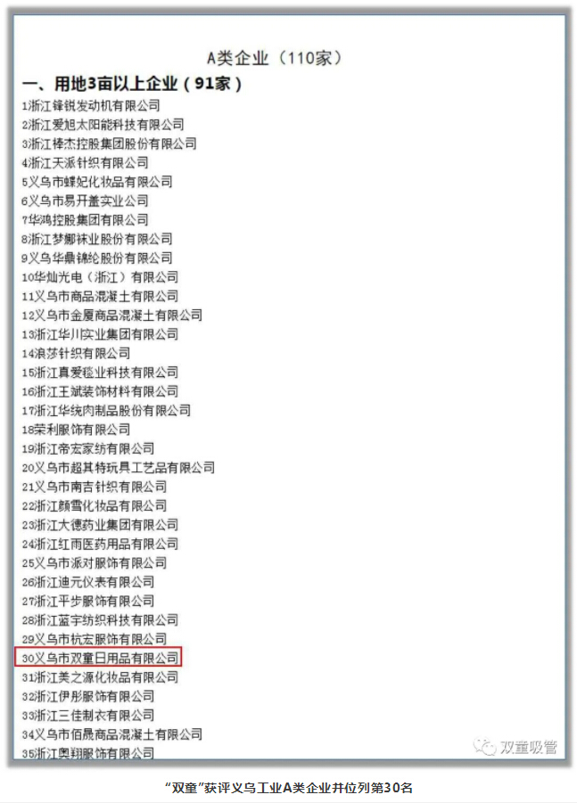 近期,義烏工業(yè)企業(yè)“畝均論英雄”評價結(jié)果已出爐。“雙童”在義烏2094家工業(yè)企業(yè)中獲評A類企業(yè),并取得了前所未有的好成績,從2018年的第62名直線晉升到2019年的第30名!