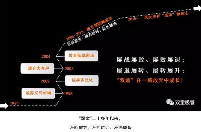 2003年,“雙童”放棄了多元經(jīng)營,放棄了低價貼牌加工的“大客戶”,提出了“兩條腿走路”和“小客戶原則”;