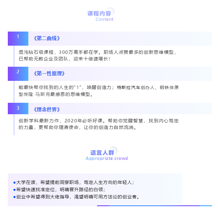 看到這里,相信你已經(jīng)對這些課程有了一定的了解,如果你是這些人群當(dāng)中的一員,如果你想有所改變,那就趕快掃碼體驗(yàn)吧!300萬創(chuàng)新者邀你同行,找到“1”,一秒看清本質(zhì),即刻開掛。