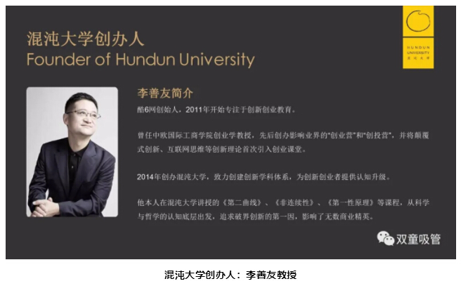 你好,我是李善友,我是一個(gè)講課的人,你或許知道我,我創(chuàng)辦了一個(gè)民營的學(xué)校——混沌大學(xué),這些年,混沌大學(xué)陪伴了上百萬中國的創(chuàng)業(yè)者,我們基于哲學(xué)和科學(xué)思維,尋找本質(zhì),打破邊界和大家一起探索中國的商業(yè)創(chuàng)新。