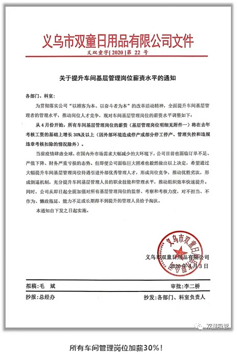 4月3日,“雙童”給所有生產(chǎn)一線管理人員逆勢加薪30%。消息一出,引起社會很大反響。為什么要這樣做?因?yàn)樵谝咔橹?,大量企業(yè)停產(chǎn),大量的管理人員處在流動之中,我們意識到這是一次很好的吸納人才的機(jī)會,進(jìn)而為企業(yè)未來的發(fā)展注入了新的活力。