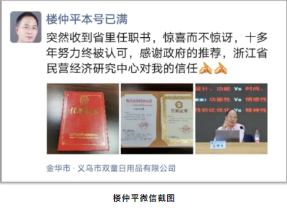 好消息!近日,“雙童”樓仲平被浙江省民營(yíng)經(jīng)濟(jì)研究中心聘請(qǐng)為副主席,以后將對(duì)我們浙江省的民營(yíng)經(jīng)濟(jì)發(fā)展做更多工作和貢獻(xiàn),也能更好代表我們浙江企業(yè)主發(fā)聲提議,爭(zhēng)取推動(dòng)浙江民營(yíng)經(jīng)濟(jì)更好的發(fā)展!