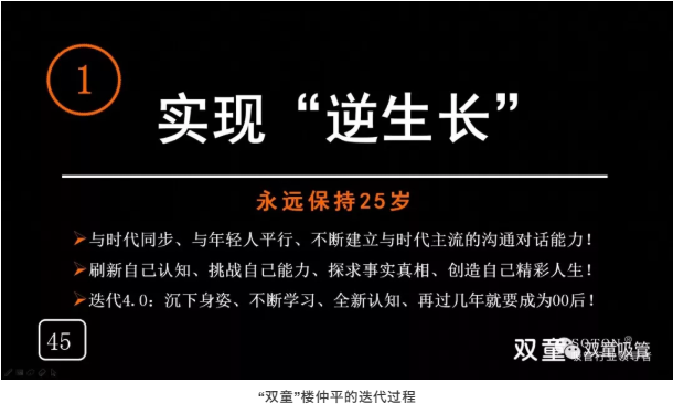 而要實現(xiàn)持續(xù)成長,“雙童”樓仲平認為:在巨變時代下,成長就需要克服人性弱點的惰性,不斷地進行自我迭代,與年輕人為伍,不斷與他們發(fā)生鏈接和建立對話的能力,從而獲得持續(xù)成長!