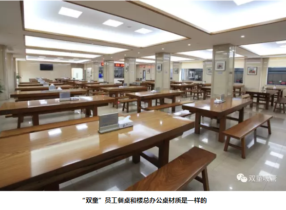 因此,“雙童”的員工餐廳配備了優(yōu)質(zhì)硬件,每一張餐桌重達(dá)四五百斤,由“木中之王”的柚木定制而成,兩三年油漆刷一次就和新的一樣,然而這個(gè)餐桌再過50年還會(huì)越來越值錢。