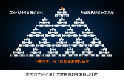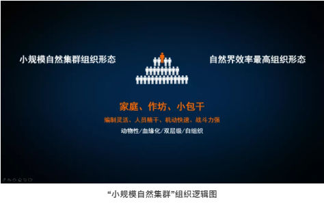 其中,樓仲平重點(diǎn)通過幾幅思維邏輯圖PPT,展現(xiàn)了在不同組織關(guān)系下的企業(yè)發(fā)展形態(tài)。從最原始的“小規(guī)模自然集群組織”邏輯圖上,我們能發(fā)現(xiàn)這種“雙層級(jí)”形式在規(guī)模較小時(shí),編制靈活,人員精干,機(jī)動(dòng)快速,戰(zhàn)斗力強(qiáng),是十分高效的組織形態(tài)。但當(dāng)規(guī)模不斷擴(kuò)張下,非常容易導(dǎo)致管理混亂的情況。