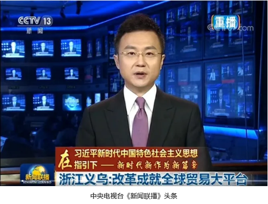 2019年12月7日,中央電視臺《新聞聯(lián)播》頭條以《【在習(xí)近平新時代中國特色社會主義思想指引下——新時代 新作為 新篇章】浙江義烏:改革成就全球貿(mào)易大平臺》為標(biāo)題,聚焦義烏改革發(fā)展。被譽(yù)為世界小商品之都的浙江義烏,銳意改革,轉(zhuǎn)型突破,從一個靠著紐扣、皮筋等不起眼的小物件起家的小商品市場,成為我國國際貿(mào)易綜合改革豐碩成果的展示區(qū)。